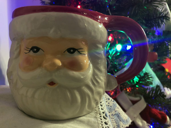 Mom loved Christmas and would decorate all over the house, including the bathroom. That is how I know if someone is truly dedicated to decorating for Christmas, if the bathroom is included. In the living room, Mom used to put out large, plastic figurines of an elf riding Rudolph, mice playing on a Christmas present, and a Santa Claus sleigh. There was also a Santa doll and a Santa mug. There were many other decorations over the years as well, but those are the ones I remember most from my childhood.